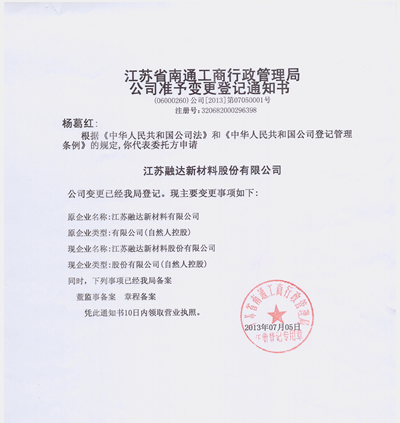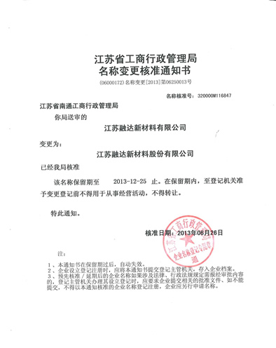 為推動(dòng)可持續(xù)發(fā)展,為公司邁入資本市場(chǎng)做準(zhǔn)備,公司全體股東投票決定同意將江蘇融達(dá)新材料有限公司更名為江蘇融達(dá)新材料股份有限公司,并提交江蘇省工商行政管理局審批通過(guò)。